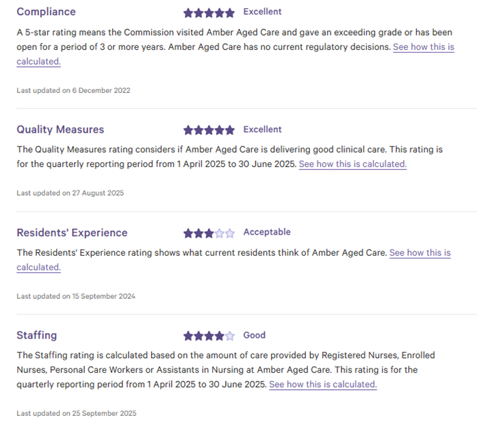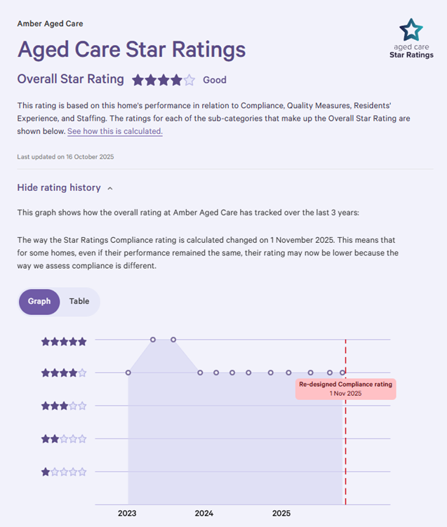 The Star Ratings Compliance Rating is based on an aged care home’s compliance performance and history. It is updated when non-compliance decisions are issued and resolved.